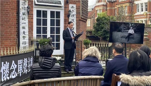 中国驻英国大使馆江雷公参代表郑泽光大使和使馆致悼词,高度评价单声先生一生赤子丹心,情系桑梓,为促进中英友好和中国和平统一大业作出不可磨灭的贡献。他的家国情怀、崇高品格和无私奉献精神,我们必将永远铭记,并激励后人不懈前行。